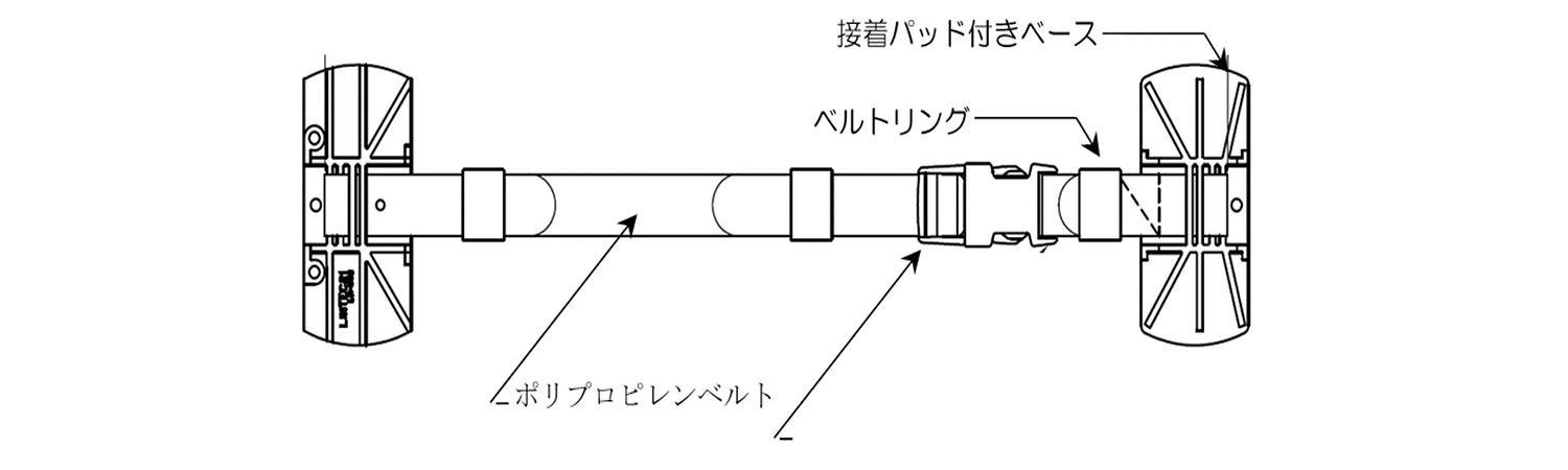 ベルトの一端に設けられた接着パッド付きベースを壁面に接着固定し、もう片側を対象物天板に接着固定して使用します。 |